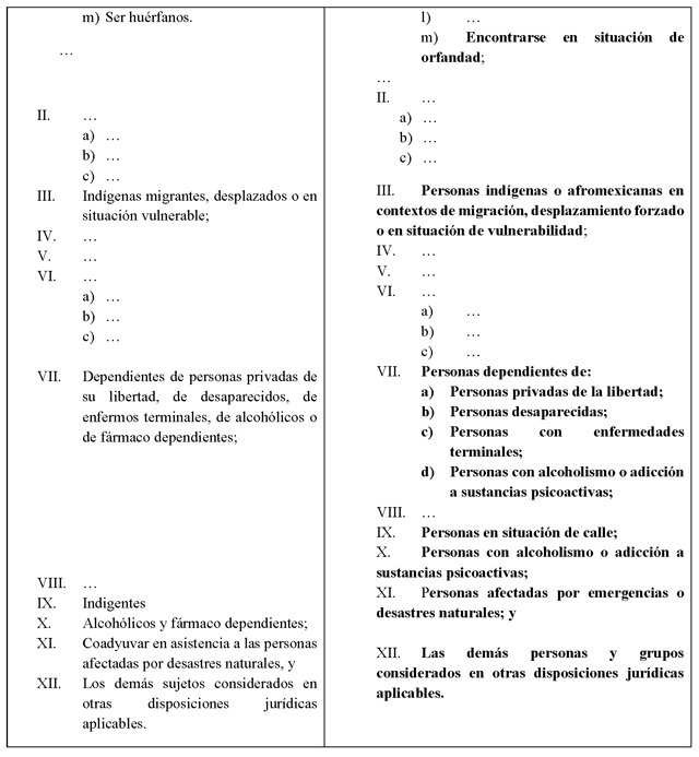 Finalmente, la reforma actualiza el lenguaje con el que se redactó la ley, erradicando con ello terminología estigmatizante. Conceptos como indigentes, alcohólicos o formacodependientes no son neutrales; son instrumentos ideológicos que patologizan y criminalizan a las víctimas del orden social, culpabilizándolas de su propia opresión. Al sustituirlos por un lenguaje centrado en la persona y en la situación como personas en situación de calle o, en situación de orfandad, la reforma avanza en construir un andamiaje legal incluyente e inclusivo.