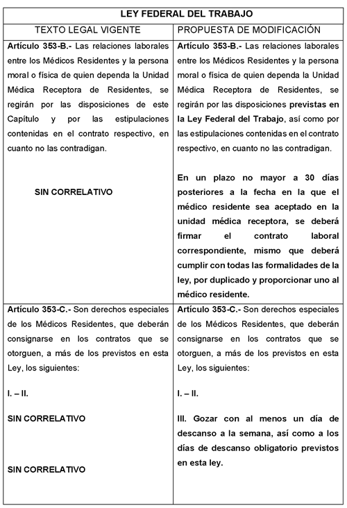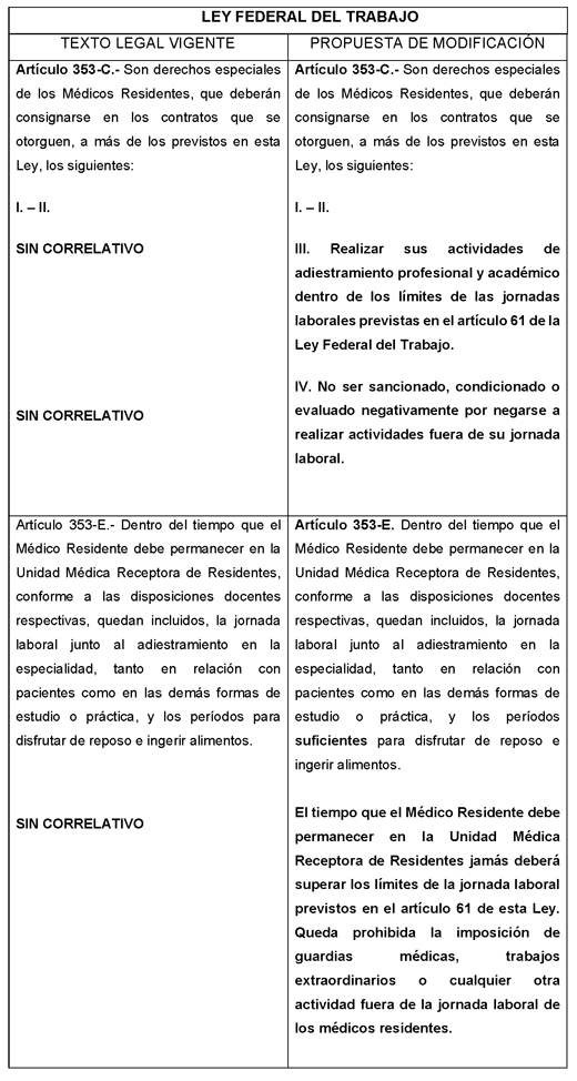 A fin de atender los principales problemas que sufren los médicos residentes, se propone reformar la Ley Federal del Trabajo de la siguiente forma: