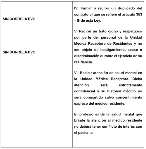 Con el objeto de garantizar su acceso a la salud mental se adiciona una fracción VI al artículo 353 C para establecer que los médicos residentes tienen derecho a recibir atención de salud mental en la Unidad Médica Receptora de forma confidencial. Así mismo, se propone que el profesional de la salud mental que brinde la atención al médico residente no deberá tener conflicto de interés con el paciente.