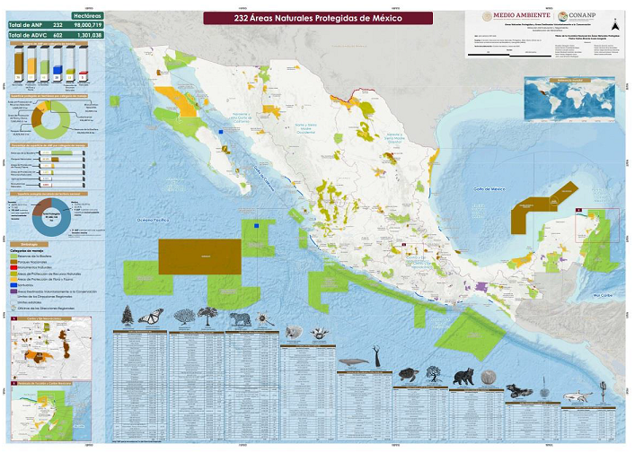 La Comisión Nacional de áreas naturales protegidas (CONANP), administra actualmente 232 áreas naturales protegidas de carácter federal que representan 98,000,719 hectáreas y apoya 602 Áreas Destinadas Voluntariamente a la Conservación, con una superficie de 1,301,037.94 hectáreas, en 29 entidades federativas.2