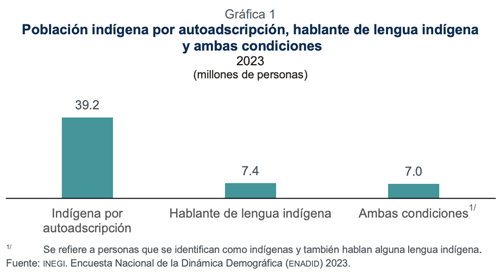 En México, de acuerdo al Inegi la población indígena que generó la Enadid 2023, permite estimar el total de población autoadscrita como indígena y aquella que habla, al menos, una lengua indígena. De acuerdo con estos resultados, en México 39.2 millones de personas se identificaron como indígenas, en tanto que 7.4 millones de personas de 3 años y más hablaban alguna lengua indígena. Por su parte, 7.0 millones de personas cumplían con ambas condiciones (ver gráfica 1).4