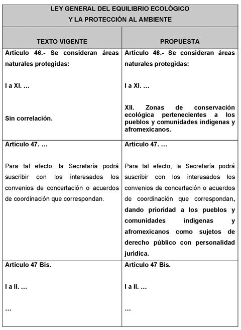 Para mayor claridad a la propuesta de la iniciativa que presento y que tiene por objeto adiciona la fracción XII, al artículo 46, se reforma el segundo párrafo, al artículo 47º; y, se reforma el último párrafo, al artículo 47 Bis, de la Ley General del Equilibrio Ecológico y la Protección al Ambiente, me permito ilustrarla con el siguiente cuadro comparativo: