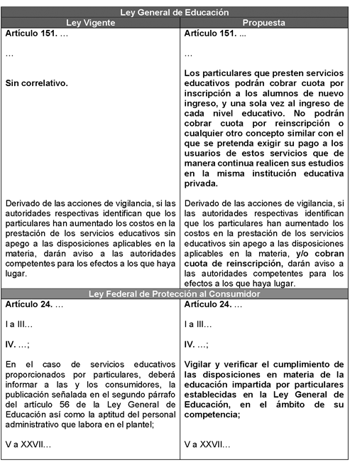 Esta modificación a la ley se complementa con la reforma que se propone para establecer que, si las autoridades respectivas identifican que los particulares cobran cuota de reinscripción, darán aviso a las autoridades competentes para los efectos a los que haya lugar. Con estas modificaciones al marco legal además de que se beneficiaría la economía familiar, se abriría la posibilidad de que las escuelas particulares incrementaran su matrícula.