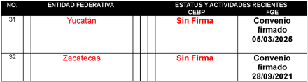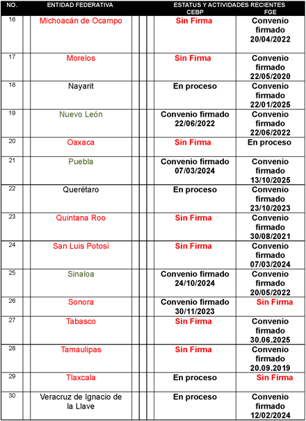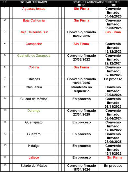 A la fecha del informe, el INE ha firmado diversos convenios de colaboración con Fiscalías Generales Estatales (FGE) y Comisiones Estatales de Búsqueda de Personas (CEBP), de las 32 entidades federativas. En ese sentido, se anexa la siguiente tabla (elaborada con los datos recabados del Informe del INE), en el que se muestra el panorama general de las (FGE) y (CEBP) de las 32 entidades federativas que han suscrito el Convenio o bien, en el que se identifican aquellas instituciones interesadas que se encuentran en proceso de integración, con corte al 20 de noviembre de 2025:
