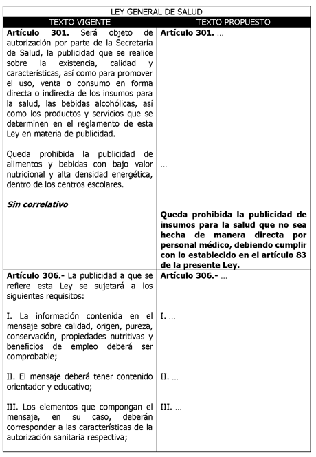 De esos, existen más ejemplos, por lo que la presente iniciativa tiene como objetivo, establecer la prohibición de la publicidad de insumos para la salud que no sea hecha por personal de la salud en términos de la Ley General de Salud.