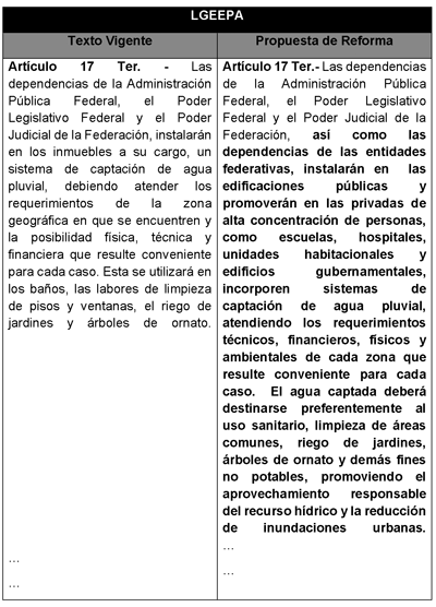 Artículo 17 Ter. Las dependencias de la Administración Pública Federal, el Poder Legislativo Federal y el Poder Judicial de la Federación, así como las dependencias de las entidades federativas, instalarán en las edificaciones públicas y promoverán en las privadas de alta concentración de personas, como escuelas, hospitales, unidades habitacionales y edificios gubernamentales, incorporen sistemas de captación de agua pluvial, atendiendo los requerimientos técnicos, financieros, físicos y ambientales de cada zona que resulte conveniente para cada caso. El agua captada deberá destinarse preferentemente al uso sanitario, limpieza de áreas comunes, riego de jardines, árboles de ornato y demás fines no potables, promoviendo el aprovechamiento responsable del recurso hídrico y la reducción de inundaciones urbanas.