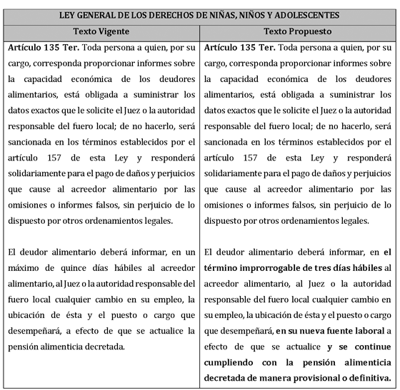 Ahora bien, respecto a la Ley General de los Derechos de Niñas, Niños y Adolescentes , en su artículo 135 Ter, establece la obligación del deudor alimentario de informar, en un plazo máximo de quince días hábiles, cualquier cambio relacionado con su empleo, ubicación laboral o el puesto que desempeñe, ya sea al acreedor alimentario, al juez o a la autoridad competente del fuero local.