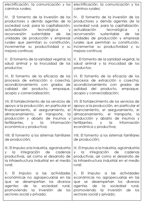 Artículo 32. El Ejecutivo Federal, con la participación de los gobiernos de las entidades federativas y de los municipios y los sectores social y privado del medio rural, impulsará las actividades económicas en el ámbito rural. Las acciones y programas que se establezcan para tales propósitos se orientarán a incrementar la productividad y la competitividad en el ámbito rural, a fin de fortalecer el empleo y elevar el ingreso de los productores; a generar condiciones favorables para ampliar los mercados agropecuarios; a aumentar el capital natural para la producción, y a la constitución y consolidación de empresas rurales.