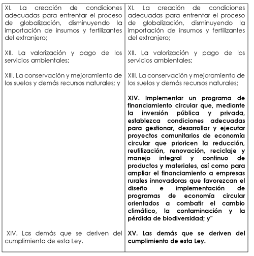 Con base en estos preceptos, se propone la siguiente iniciativa con proyecto de decreto por el que se reforma la fracción XIV y se adiciona la fracción XV al artículo 32 de la Ley de Desarrollo Rural Sustentable, para implementar un programa de financiamiento de economía circular, que impulse las actividades económicas en el ámbito rural y al mismo tiempo, favorezca el desarrollo sostenible, integral, incluyente y regenerativo.