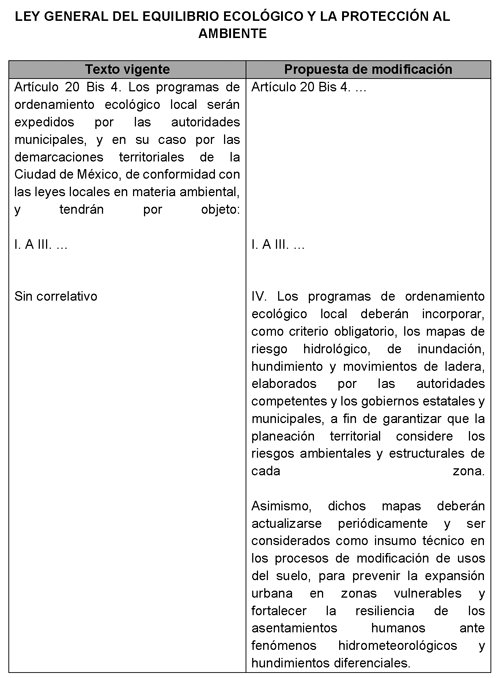 La presente iniciativa tiene como propósito fortalecer la planeación territorial y la gestión ambiental del país mediante la incorporación de criterios obligatorios de prevención de riesgos hidrológicos, hundimientos y fenómenos asociados al cambio climático en los procesos de ordenamiento ecológico y desarrollo urbano.