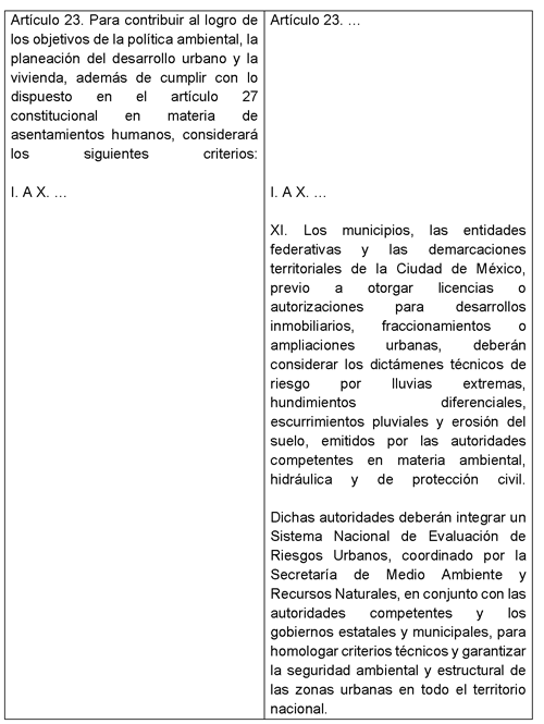 Por su parte, la reforma al artículo 23 complementa este esfuerzo al establecer que los municipios, las entidades federativas y las demarcaciones territoriales de la Ciudad de México deberán considerar dictámenes técnicos de riesgo antes de otorgar licencias de construcción, fraccionamientos o ampliaciones urbanas.