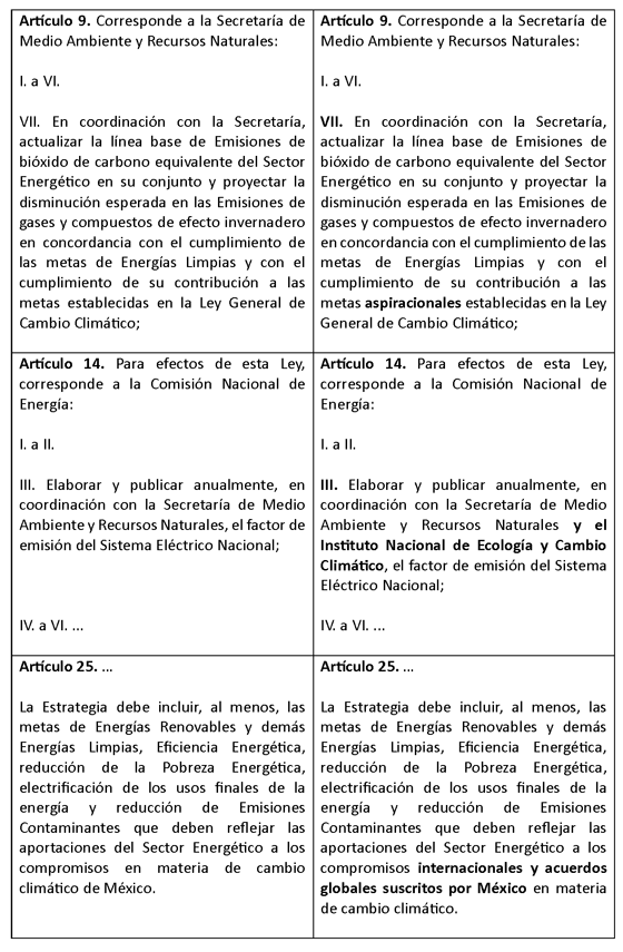 Por lo anterior, es necesario vincular el cambio climático con la Ley de Planeación y Transición Energética, en el que se deberán cumplir con las metas aspiracionales en materia de energía limpia, eficiencia energética y reducción de emisiones de gases efecto invernadero, realizándose un diagnóstico exhaustivo para conocer el estado en el que se encuentra la industria eléctrica relacionada con la contaminación ambiental ocasionada por esta, así como el cumplimiento de las metas en estos sectores y la promoción del desarrollo de las energías limpias como un elemento que contribuye al desarrollo y bienestar socioeconómico del país.