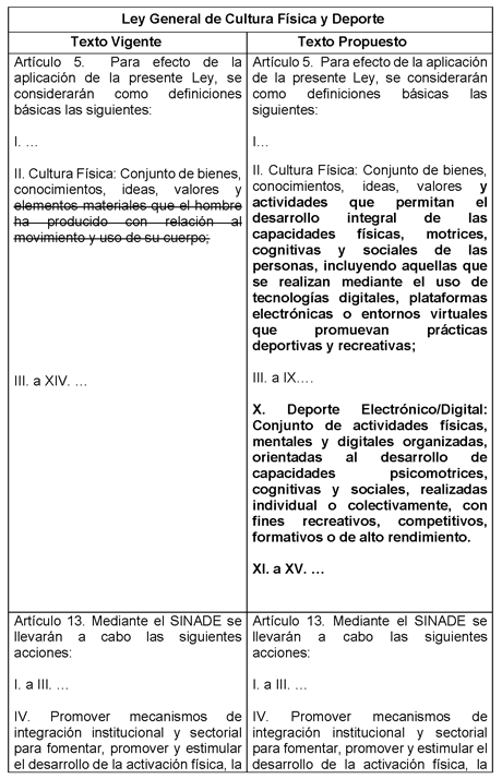 Asimismo, la incorporación de una definición expresa de deporte digital en el artículo 5 de la ley en comento, constituye un avance normativo necesario para adecuar el marco jurídico a las transformaciones tecnológicas que actualmente configuran nuevas formas de práctica deportiva y recreativa. Integrar esta categoría dentro del conjunto de bienes, conocimientos, ideas, valores y actividades orientadas al desarrollo integral de las capacidades físicas, motrices, cognitivas y sociales permite dotar de certeza jurídica a autoridades, instituciones y personas usuarias respecto del alcance y reconocimiento formal de estas modalidades. Esta definición habilita la construcción de políticas públicas específicas, la homologación de criterios técnicos, la generación de estándares de seguridad y protección de datos, así como la inclusión de nuevas disciplinas en programas educativos y de activación física. En consecuencia, su incorporación no solo moderniza el marco legal, sino que fortalece la igualdad de acceso, promueve la innovación y consolida un entorno regulatorio acorde con las mejores prácticas internacionales.