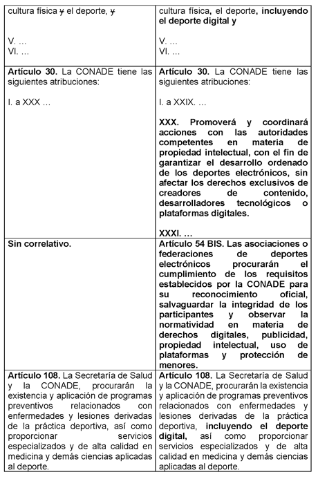 En conjunto, las reformas de los artículos 5, 13, 30, 54 Bis y 108 forman un marco jurídico completo que permite transitar del simple reconocimiento del deporte digital a su regulación integral dentro del sistema deportivo nacional, sin que las mismas impliquen impacto presupuestal, que frene la operatividad de estas. Se establecen definiciones modernas, mecanismos de coordinación institucional, regulaciones operativas claras y políticas de salud especializadas, todo ello orientado a garantizar un crecimiento sostenible, ordenado y profesional del deporte digital en México. Con estas modificaciones, la ley no solo abre la puerta a un nuevo capítulo en la política deportiva del país, sino que genera las bases para que el deporte digital florezca como una actividad educativa, competitiva, económica y cultural de alto impacto para las generaciones presentes y futuras.