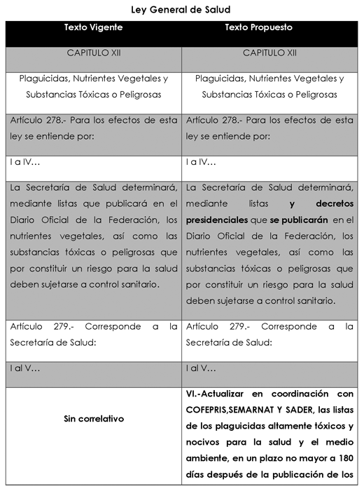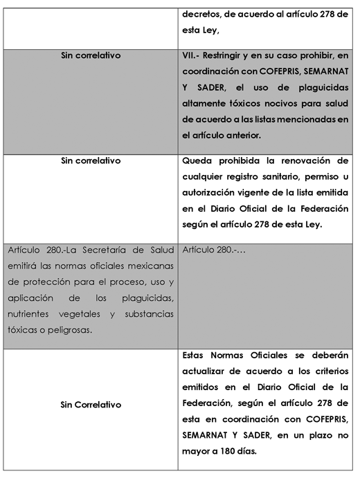 VI. Actualizar en coordinación con la Comisión Federal para la Protección contra Riesgos Sanitarios, la Secretaría de Medio Ambiente y Recursos Naturales y la Secretaría de Agricultura y Desarrollo Rural, las listas de los plaguicidas altamente tóxicos y nocivos para la salud y el medio ambiente, en un plazo no mayor a 180 días después de la publicación de los decretos, de acuerdo al artículo 278 de esta ley,