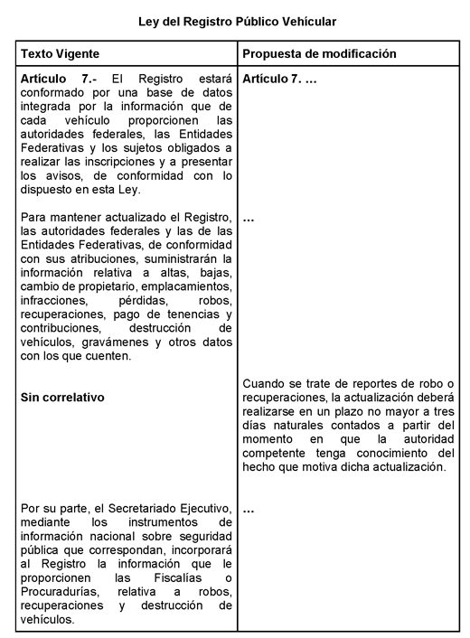 Esta iniciativa coloca al centro el interés de la ciudadanía y dota al Estado mexicano de herramientas más sólidas para actuar de manera oportuna ante el robo de vehículos. Por ello, someto a consideración de esta soberanía la siguiente