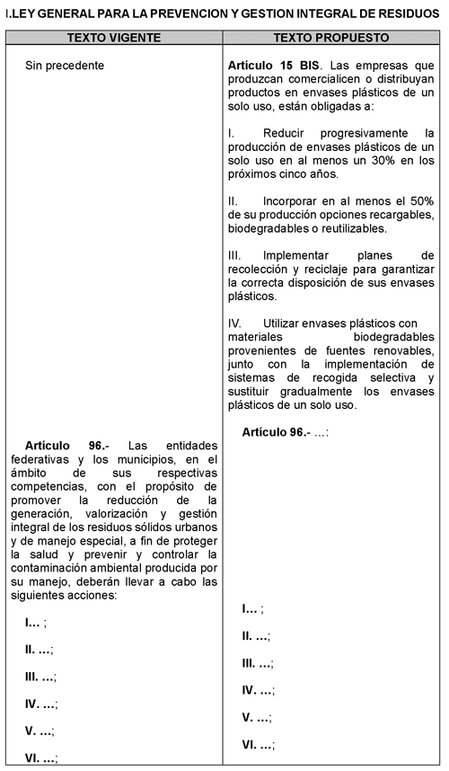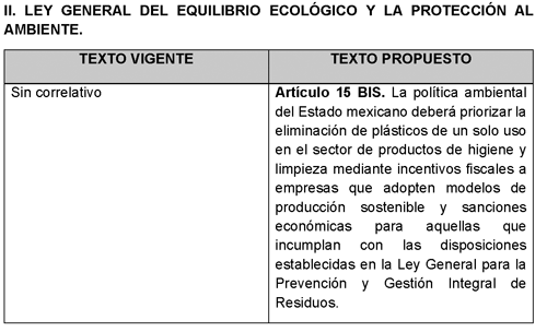 Artículo 15 Bis. La política ambiental del Estado mexicano deberá priorizar la eliminación de plásticos de un solo uso en el sector de productos de higiene y limpieza mediante incentivos fiscales a empresas que adopten modelos de producción sostenible y sanciones económicas para aquellas que incumplan con las disposiciones establecidas en la Ley General para la Prevención y Gestión Integral de los Residuos.