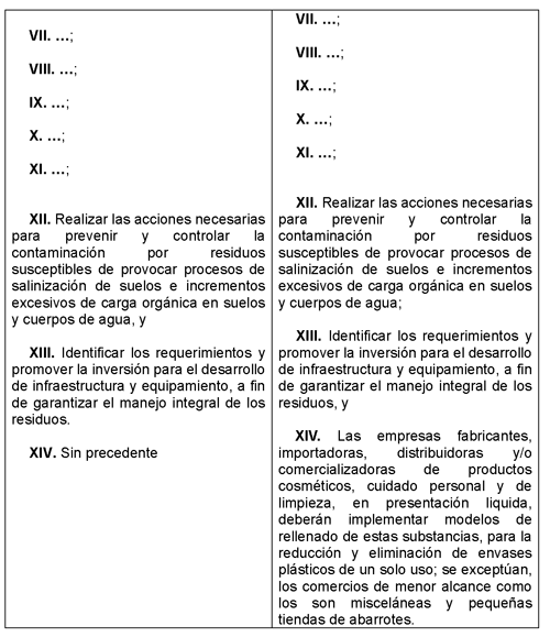 XIV. Las empresas fabricantes, importadoras, distribuidoras y/o comercializadoras de productos cosméticos, cuidado personal y de limpieza, en presentación líquida, deberán implementar modelos de rellenado de estas substancias, para la reducción y eliminación de envases plásticos de un solo uso; se exceptúan, los comercios de menor alcance como los son misceláneas y pequeñas tiendas de abarrotes.