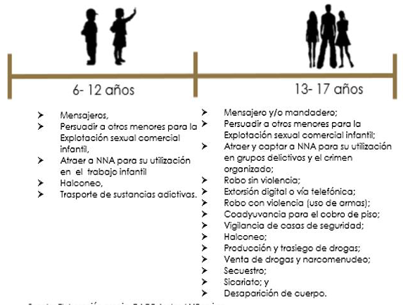 Así, los cárteles de la droga buscan incorporar en sus filas a personas menores de 18 años, buscando adoctrínalos e incrementando sus responsabilidades en la organización conforme van creciendo. De acuerdo con el estudio Mecanismo estratégico del reclutamiento y utilización de NNA por grupos delictivos 4 las actividades delictivas de las infancias se dan en las siguientes actividades: