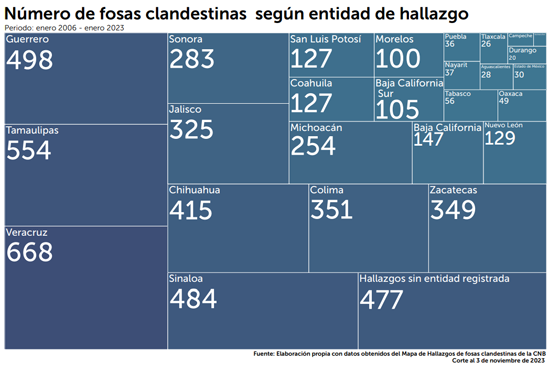 La situación de este tipo de desapariciones es tan grave que entre 2006 y 2023 se localizaron 5 mil 698 fosas clandestinas de las cuales se destacan 668 ubicadas en Veracruz, 554 en Tamaulipas, 498 en Guerrero 484 en Sinaloa y 415 en Chihuahua. Esto vulnera aún más de los derechos de las víctimas porque existen alrededor de 52 mil cuerpos localizados que no han sido identificados. Así, en el siguiente mapa se registran el total de fosas localizadas en todo el país: