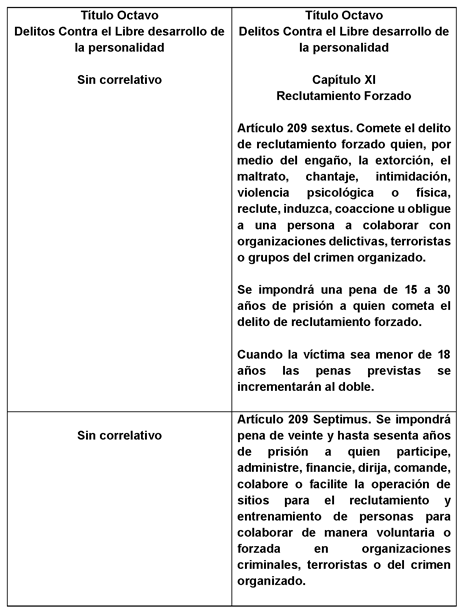 Único: Se adicionan el Capítulo XI Reclutamiento Forzado al Título Octavo y los artículos 209 Sextus y 209 Séptimus al Código Penal Federal, para quedar como sigue: