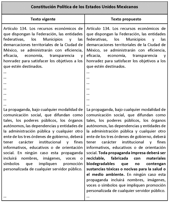 Por estas razones, la presente iniciativa propone reformar el artículo 134 de la Constitución Política de los Estados Unidos Mexicanos, en materia de basura electoral. Derivado de lo anterior se anexa el siguiente cuadro comparativo para una mejor comprensión: