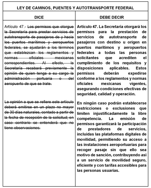 Por tal razón, la presente iniciativa es fundamental para garantizar el derecho humano a la movilidad en condiciones de igualdad, seguridad y accesibilidad para todas y todos los mexicanos. Al eliminar barreras injustificadas y permitir que más prestadores de servicios, incluidas las plataformas digitales, operen de manera regulada en aeropuertos y puertos federales, se fortalece la libre competencia y se amplían las alternativas de transporte para la ciudadanía. Con ello, se promueve un servicio más seguro, eficiente y con tarifas justas, respondiendo a las necesidades reales de millones de personas que requieren opciones modernas y confiables para desplazarse. Esta reforma no solo actualiza el marco legal a la realidad del país, sino que coloca en el centro a las y los usuarios, impulsando una movilidad más digna y accesible.