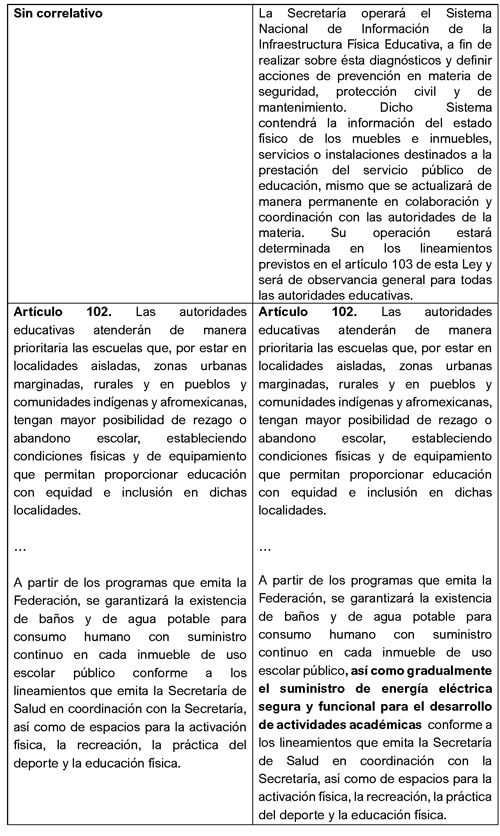 Artículo 102. Las autoridades educativas atenderán de manera prioritaria las escuelas que, por estar en localidades aisladas, zonas urbanas marginadas, rurales y en pueblos y comunidades indígenas y afromexicanas, tengan mayor posibilidad de rezago o abandono escolar, estableciendo condiciones físicas y de equipamiento que permitan proporcionar educación con equidad e inclusión en dichas localidades.