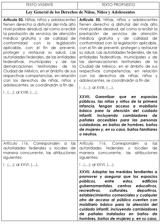 2. Se propone adicionar la fracción XXVII al artículo 116 de la Ley General de los Derechos de Niñas, Niños y Adolescentes a fin de facultar a las autoridades federales y locales para que adopten las medidas tendientes a promover y asegurar que los espacios públicos, entre estos, edificios gubernamentales, centros educativos, recreativos, culturales, deportivos, establecimientos comerciales y cualquier otro de acceso al público cuenten con mobiliario básico para la atención del cuidado infantil, incluyendo cambiadores de pañales instalados en baños de hombres, baños de mujeres y, en su caso, baños familiares o neutros accesibles para las personas cuidadoras.