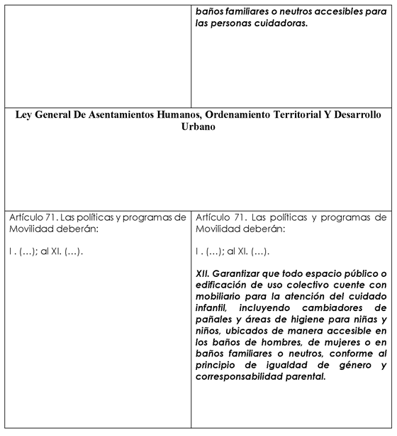 3. Se propone adicionar la fracción XII del artículo 71 de la Ley General de Asentamientos Humanos, Ordenamiento Territorial y Desarrollo Urbano para que las autoridades competentes garantizarán que todo espacio público o edificación de uso colectivo cuente con mobiliario para la atención del cuidado infantil, incluyendo cambiadores de pañales y áreas de higiene para niñas y niños, ubicados de manera accesible en los baños de hombres, de mujeres o en baños familiares o neutros, conforme al principio de igualdad de género y corresponsabilidad parental.