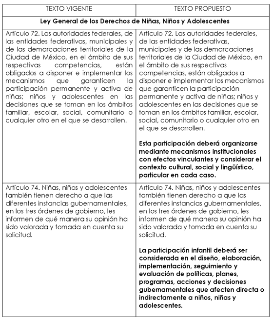 1. Se propone adicionar un segundo párrafo al artículo 72 de la Ley General de los Derechos de Niñas, Niños y Adolescentes para garantizar los mecanismos de participación infantil. Precisar en el texto legal que las autoridades deberán organizar la participación infantil a través de mecanismos institucionales con efectos vinculantes, y que para tal efecto deberán considerar el contexto particular de cada caso, dota de garantías materiales a las infancias para que se escuchen y atiendan sus intereses, preocupaciones, opiniones, y se consideren sus propuestas.