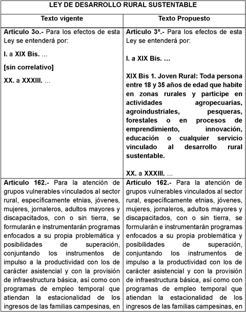 El cuadro que a continuación se presenta, sintetiza en qué consiste el proyecto de decreto de la iniciativa con proyecto de decreto por el que se adicionan una fracción XIX Bis al artículo 3o., un segundo párrafo al artículo 162 y un Título Quinto a la Ley de Desarrollo Rural Sustentable, para incorporar el concepto de joven rural y establecer y las bases para el diseño e implementación políticas públicas; propuesta: