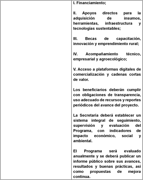 En el caso de los programas dirigidos a las mujeres y jóvenes rurales, deberán garantizarles el acceso equitativo a la tierra, financiamiento y medios de producción; la formación técnica, capacitación digital y transferencia de tecnología; la participación en la planeación y ejecución de programas de desarrollo rural; el impulso a proyectos productivos sustentables, con enfoque de género e inclusión y el acceso preferente a apoyos destinados a la innovación y la transición agroecológica.