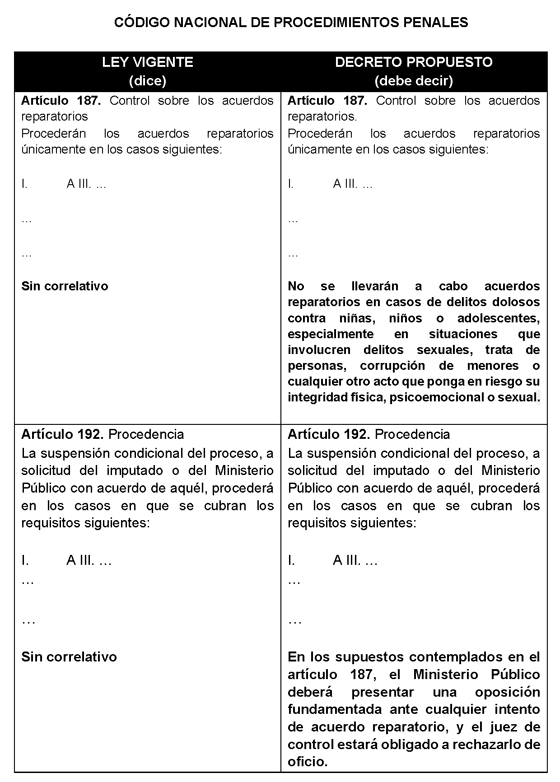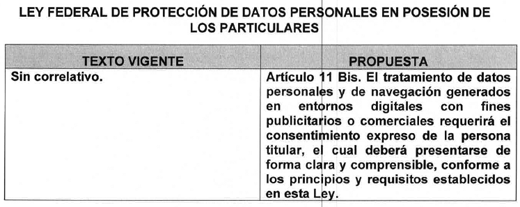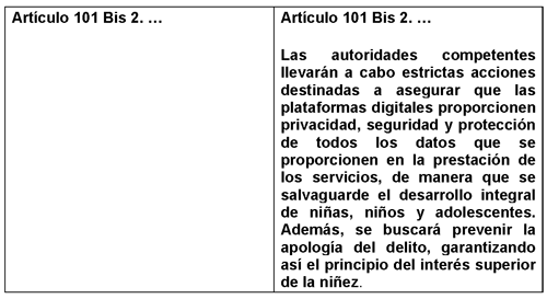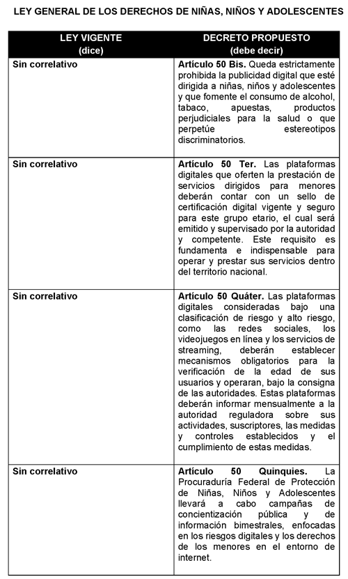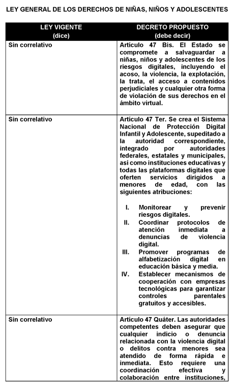 Organizaciones de la sociedad civil y especialistas han señalado la necesidad de la creación de marcos legislativos y en sus caso la creación de instituciones que pongan a la niñez por encima de cualquier interés, pues existe un reconocimiento generalizado de la necesidad de legislar sobre la responsabilidad del Estado en el cuidado de la infancia frente a los riesgos del internet, en este sentido de la iniciativa de reforma se elaboró cuadro comparativo del texto actual y la propuesta que sustenta esta exposición de motivos, como a continuación se muestra: