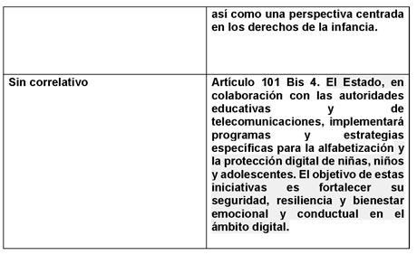 Artículo 101 Bis 4. El Estado, en coordinación con las autoridades educativas y de telecomunicaciones, desarrollará programas, estrategias y protocolos especializados en alfabetización y protección digital para niñas, niños y adolescentes, con el objeto de fortalecer su seguridad, resiliencia y bienestar emocional y conductual en entornos digitales.