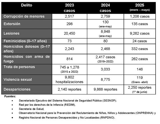 La Red por los Derechos de la Infancia en México (REDIM)6 ha señalado un preocupante incremento en delitos graves contra menores como homicidios, corrupción y violencia sexual, muchos de los cuales son perpetrados por familiares o personas cercanas a las víctimas.