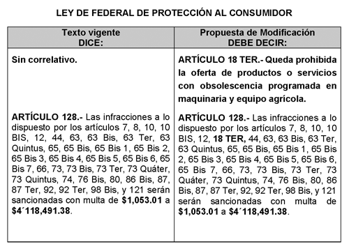Artículo 18 Ter. Queda prohibida la oferta de productos o servicios con obsolescencia programada en maquinaria y equipo agrícola.