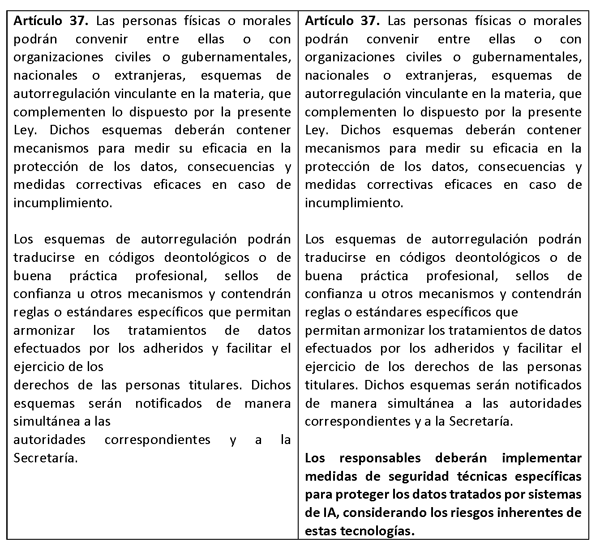 Artículo 37. Las personas físicas o morales podrán convenir entre ellas o con organizaciones civiles o gubernamentales, nacionales o extranjeras, esquemas de autorregulación vinculante en la materia, que complementen lo dispuesto por la presente Ley. Dichos esquemas deberán contener mecanismos para medir su eficacia en la protección de los datos, consecuencias y medidas correctivas eficaces en caso de incumplimiento.