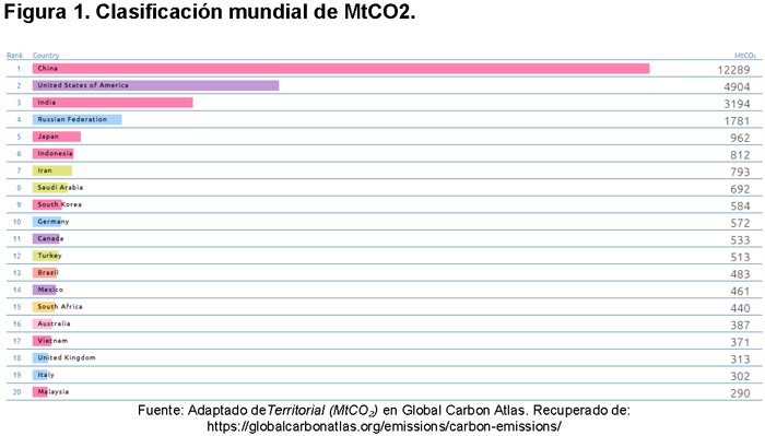 Así lo demuestran nuestros elevados registros de emisiones de gases contaminantes, gracias a los cuales, el país se encuentra en la posición 14 a nivel mundial con 461 millones de toneladas métricas de dióxido de carbono (MtCO2),6 como se muestra en la Figura 1: