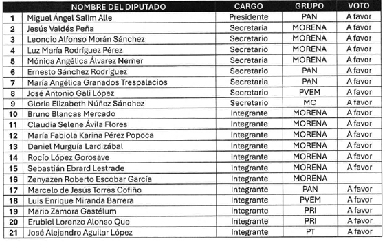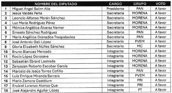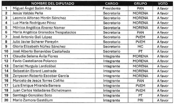 Diputados: Ana Karina Rojo Pimentel, Olegaria Carrazco Macías, Christian Mishel Castro Bello, Karina Margarita del Río Zenteno, Felipe Miguel Delgado Carrillo, Flor de María Esponda Torres, Iván Marín Rangel, Celeste Mora Eguiluz, Rosa Guadalupe Ortega Tiburcio, Gildardo Pérez Gabino, Felicita Pompa Robles, Héctor Saúl Téllez Hernández.