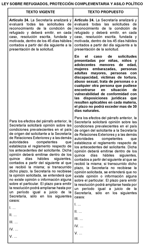Por todo lo anterior, la presente iniciativa propone reformar el artículo 24 de la Ley Sobre Refugiados, Protección Complementaria y Asilo Político, para que establecer que el caso de solicitudes presentadas por niñas, niños y adolescentes menores de edad, mujeres embarazadas, personas adultas mayores, personas con discapacidad, víctimas de tortura, abuso sexual, trata de personas o a cualquier otra persona que pudiese encontrarse en situación de vulnerabilidad de conformidad con las disposiciones jurídicas que resulten aplicables en cada materia, el plazo no podrá exceder de 30 días naturales.