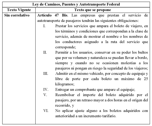 Artículo Único. Se adiciona el artículo 47 Bis, a la Ley de Caminos, Puentes y Autotransporte Federal, para quedar como sigue: