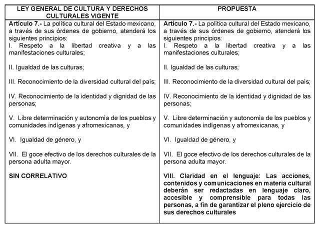 Por tanto, esta iniciativa propone adicionar una fracción VIII al artículo 7 de la Ley, para incluir el principio de lenguaje claro como guía obligatoria de la política cultural del Estado. Esto permitirá asegurar que los contenidos, convocatorias, servicios y programas culturales estén redactados de manera comprensible para toda persona, sin necesidad de conocimientos especializados.