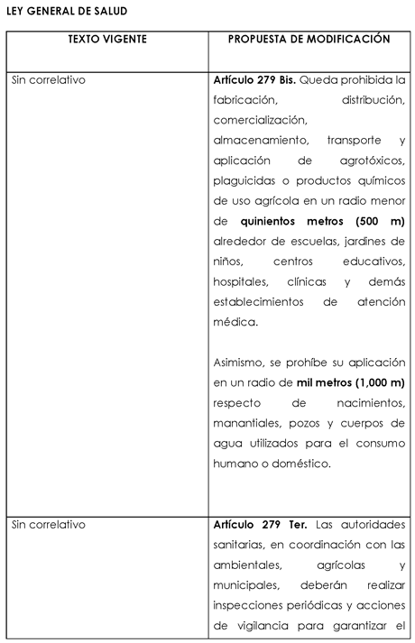 Artículo 279 Bis. Queda prohibida la fabricación, distribución, comercialización, almacenamiento, transporte y aplicación de agrotóxicos, plaguicidas o productos químicos de uso agrícola en un radio menor de quinientos metros (500 m) alrededor de escuelas, jardines de niños, centros educativos, hospitales, clínicas y demás establecimientos de atención médica.