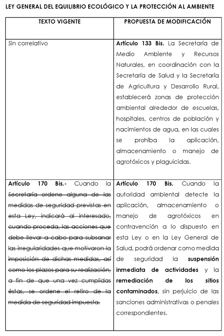 Asimismo, se plantea incorporar mecanismos de coordinación entre las autoridades sanitarias, ambientales y agrícolas, para garantizar la vigilancia, verificación y sanción del cumplimiento de estas disposiciones, promoviendo alternativas de producción agroecológica y sostenible.