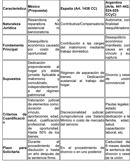 Estos ejemplos demuestran que la compensación económica es una institución consolidada en el derecho de familia contemporáneo. La siguiente tabla sintetiza las características de estos modelos en comparación con la propuesta para México.1