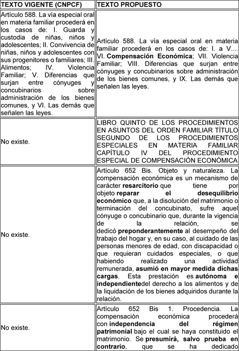 Artículo Único.- Se reforma el artículo 588 y se adiciona un Capítulo IV denominado "Del Procedimiento Especial de Compensación Económica", que comprende los artículos 652 Bis al 652 Bis 6, al Título Segundo "De los Procedimientos Especiales en Materia Familiar" del Libro Quinto "De los Procedimientos en Asuntos del Orden Familiar" del Código Nacional de Procedimientos Civiles y Familiares, para quedar como sigue 1: