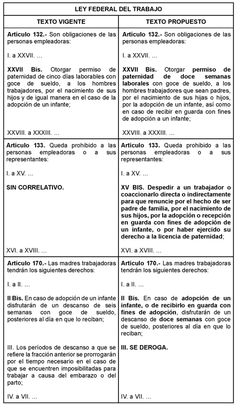 Artículo Único. Se reforman las fracciones XXVII Bis del artículo 132, fracción II Bis del artículo 170; se adiciona la fracción XV Bis al artículo 133, y se deroga la fracción III del artículo170 de la Ley Federal del Trabajo, en materia de licencias por paternidad igualitaria, para quedar como sigue: