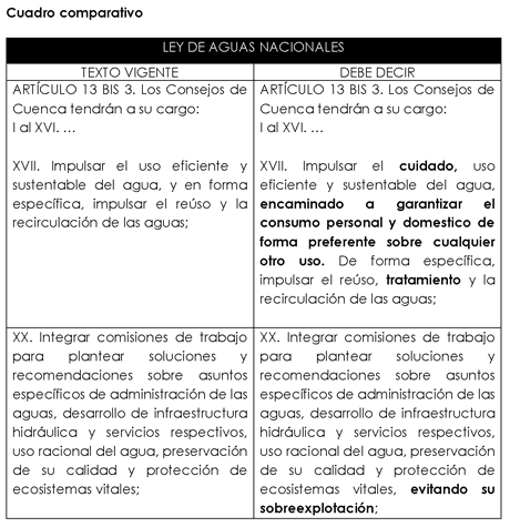 En ese sentido el Estado mexicano se obliga a garantizar el derecho humano de acceso al agua para consumo personal y uso doméstico, por encima de la explotación o sobreexplotación de uso de agua para el riego. Además, que la Ley de Aguas Nacionales ya establece que todas las personas concesionarias de aguas nacionales para uso industrial en minería (Fracking) tienen la obligación de medir el volumen de agua explotada, usada o aprovechada que se extraiga de las cuencas y acuíferos, así como las aguas provenientes de laboreo de las minas para uso industrial o de servicios.
