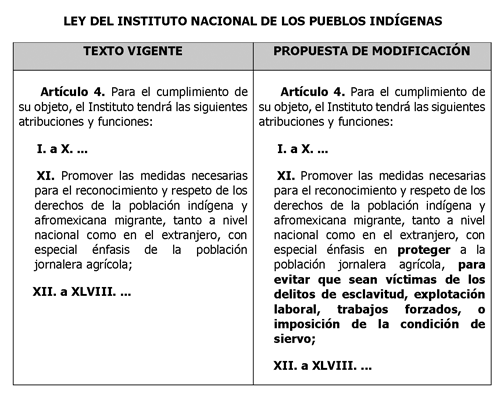La actitud que refleja esta postura de los empleadores, ratifica su permanentemente búsqueda de establecer condiciones de explotación de los jornaleros agrícolas migrantes. Por ello, la presente Iniciativa propone una reforma a la fracción XI del artículo 4 de la Ley del Instituto Nacional de los Pueblos Indígenas. Esto, con el objeto de establecer explícitamente que el INPI tendrá la atribución y función de promover medidas para proteger a la población jornalera agrícola y evitar que sean víctimas de los delitos de esclavitud, explotación laboral, trabajos forzados, o imposición de la condición de siervo.